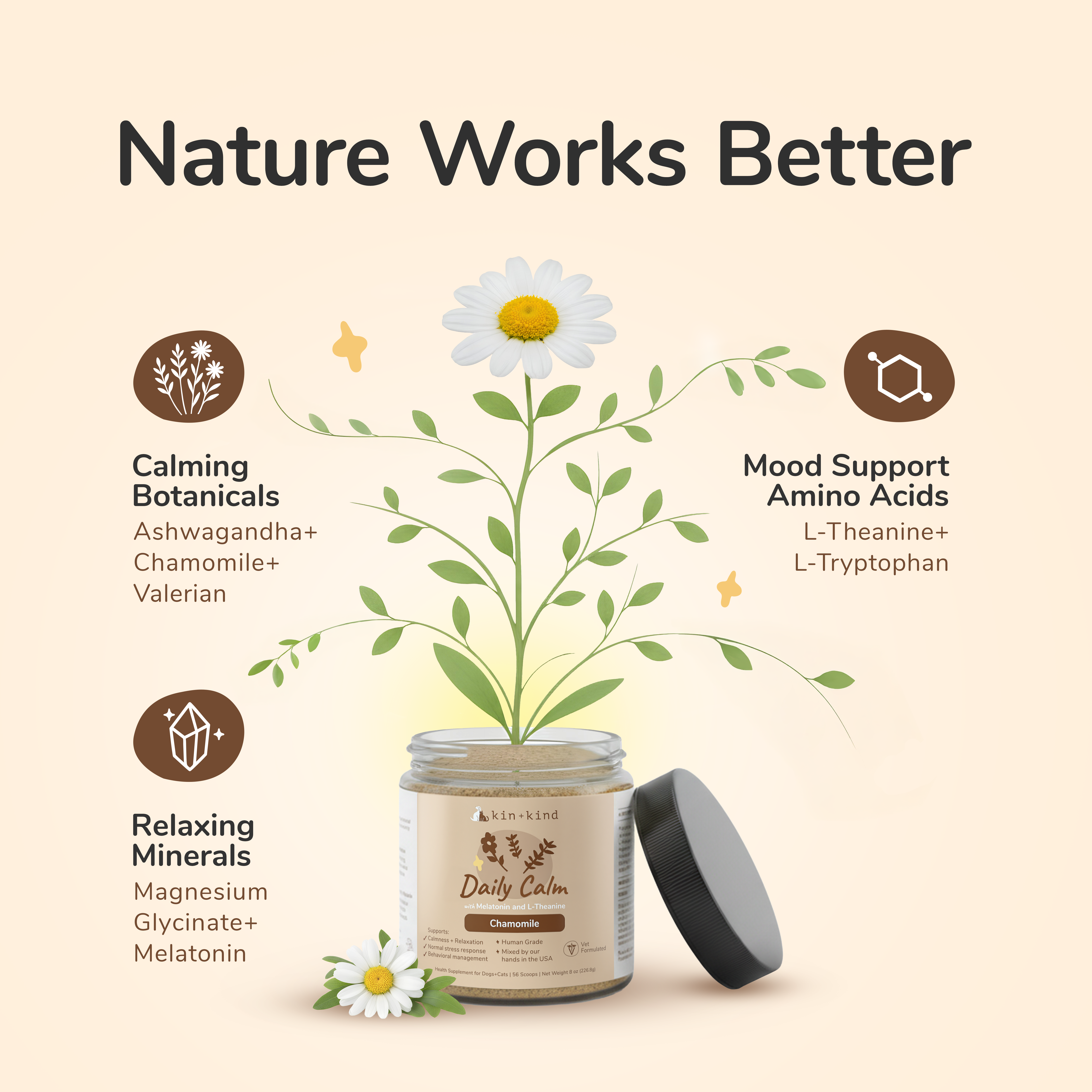 Pets love our supplements because they're made with only real superfoods and nothing else. No GMOs, grains, or preservatives. They taste good and can be easily sprinkled on top of any type of diet.